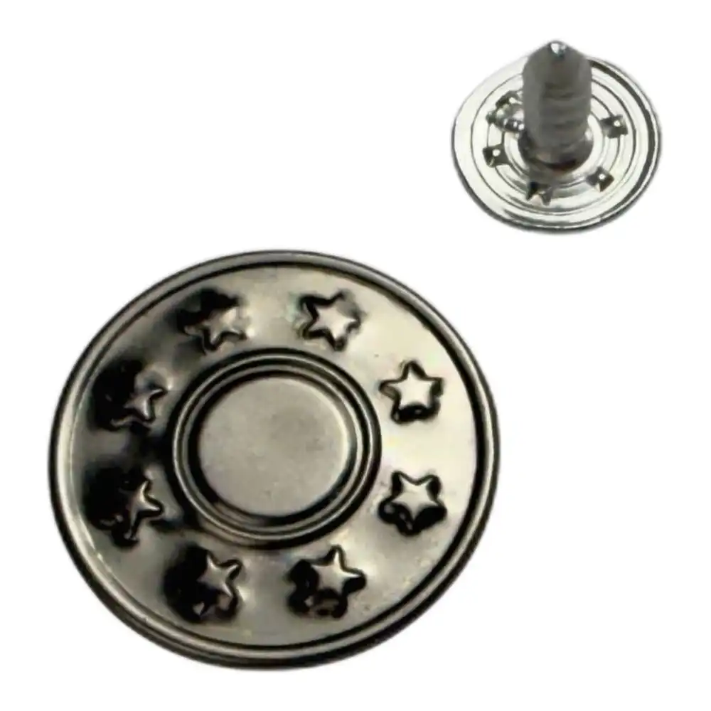 АЛЬТЕРНАТИВНЫЕ НАЗВАНИЯ: Джинсовая пуговица 17 мм, Пуговица «Звезды (2)» темного никеля, Пуговица Furtorg 17 мм, Металлическая пуговица для джинсов 17 мм, Пуговица темного никеля 17 мм от Furtorg.