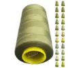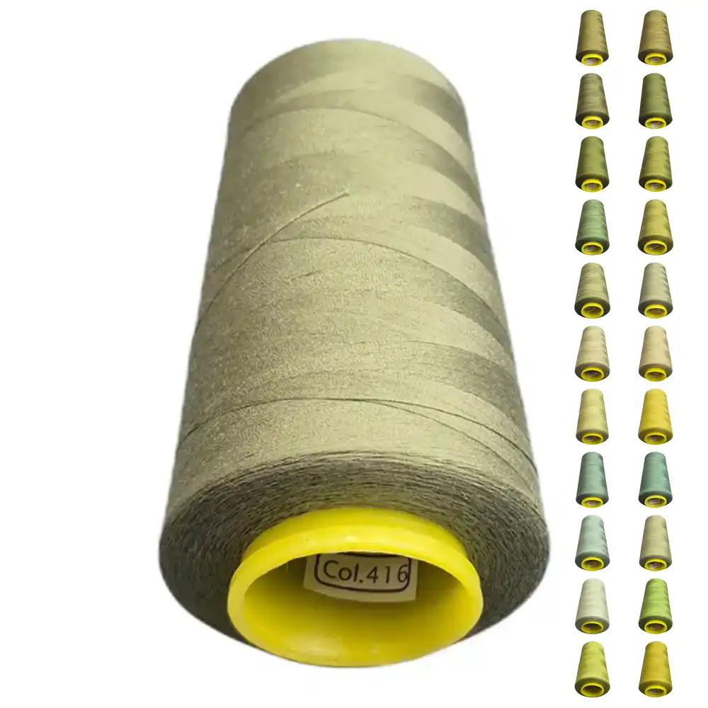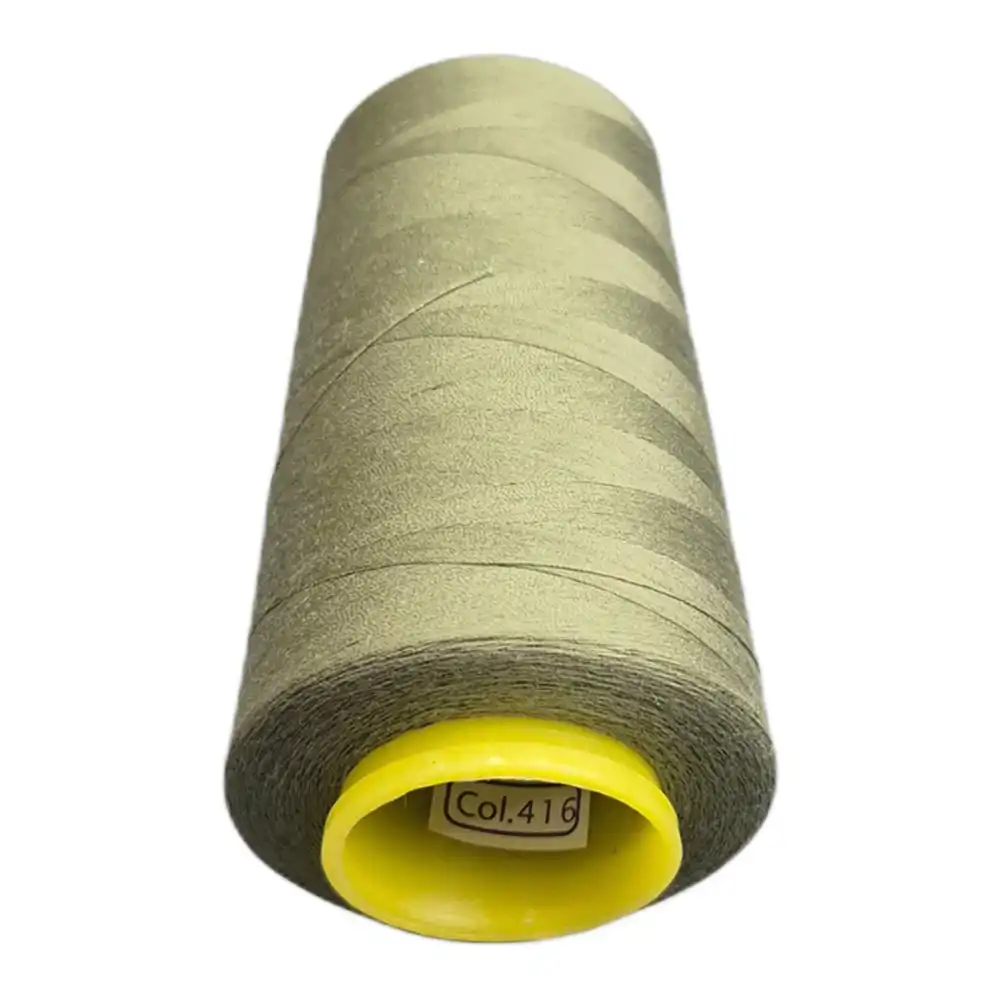 Нитки KIWI в цвете 416 имеют оливковый оттенок, который можно описать как зеленовато-серый, салатовый или масляный. Этот цвет близок к Pantone 5777 C и Pantone 7490 C. Изготовленные из полиэстера, нитки обладают высокой прочностью и малой растяжимостью, что делает их подходящими для использования в бытовых и профессиональных машинах.