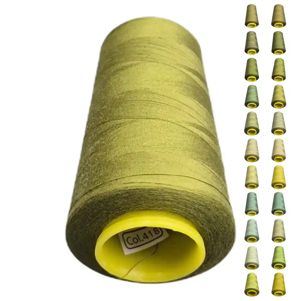 Нитки KIWI цвета 418 имеют оливковый оттенок, который можно охарактеризовать как зеленовато-желтый или масляный. Этот цвет близок к Pantone 5763 C и Pantone 7740 C. Изготовленные из полиэстера, они обладают высокой прочностью и малой растяжимостью, что делает их подходящими для использования в бытовых и профессиональных машинах.